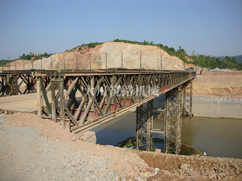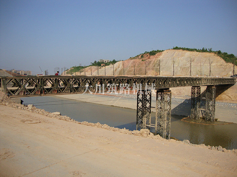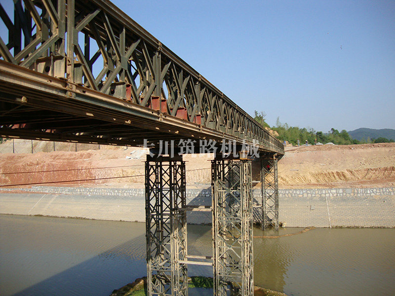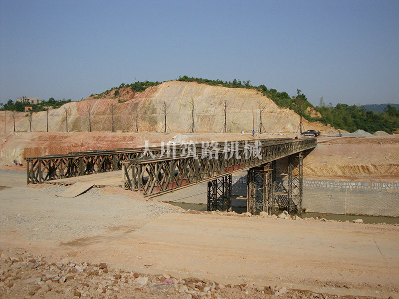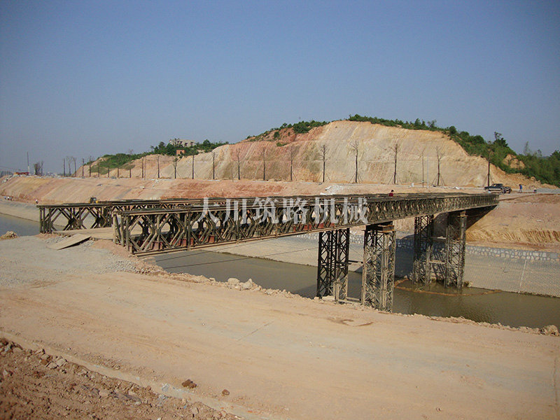 特點:本鋼橋由國防科技大學(xué)全程指導(dǎo)和監(jiān)督安裝,滿足荷載80T施工車輛通行,因施工場地要求,采用貝雷梁組合式橋墩,安裝拆除方便,穩(wěn)定性好。采用推出法安裝,安裝周期20天,于2011年5月25日通車。